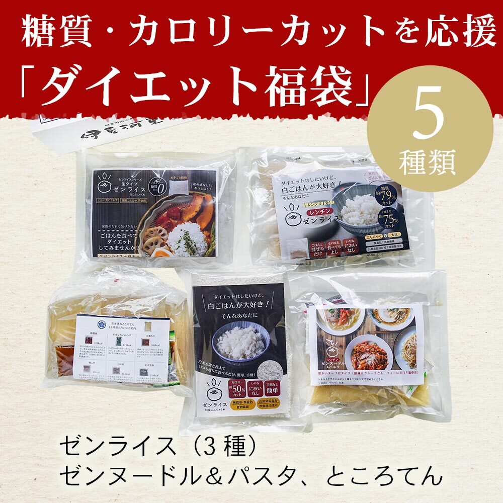 | 内容量 | ・レンチンゼンヌードル&パスタ 細麺140g×2(醤油・味噌) ・レンチンゼンヌードル&パスタ 平麺140g×2(ペペロンチーノ・トマトソース) ・ゼンライス(乾燥こんにゃく米)60g×5 ・生タイプゼンライス150g×5 ・レンチンゼンライス100g×5 ・突き済みところてん(袋入)150g×5(たれ付:酢醤油(二杯酢)・わさびドレッシング・胡麻ダレ・梅しそ・めんつゆ) |